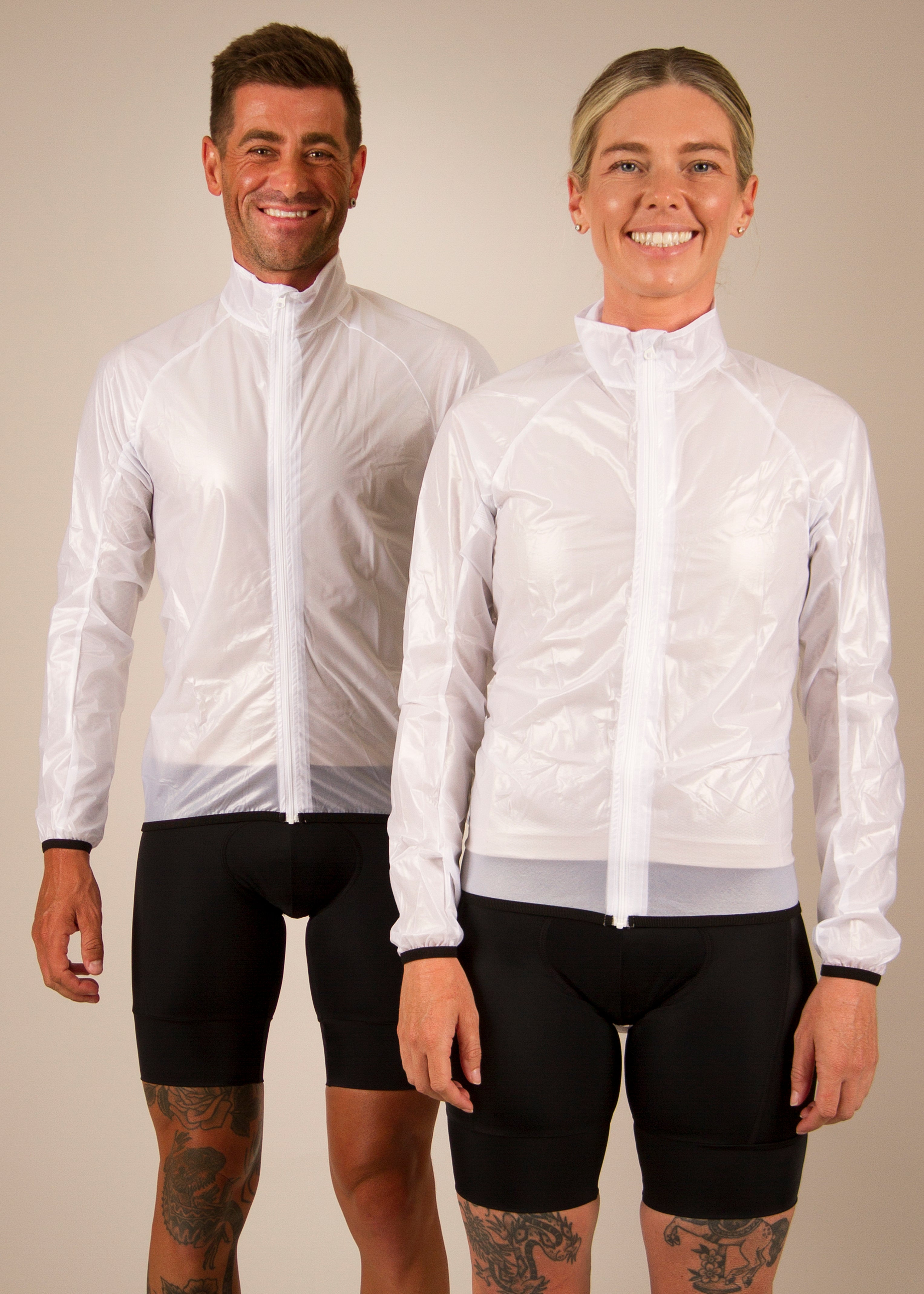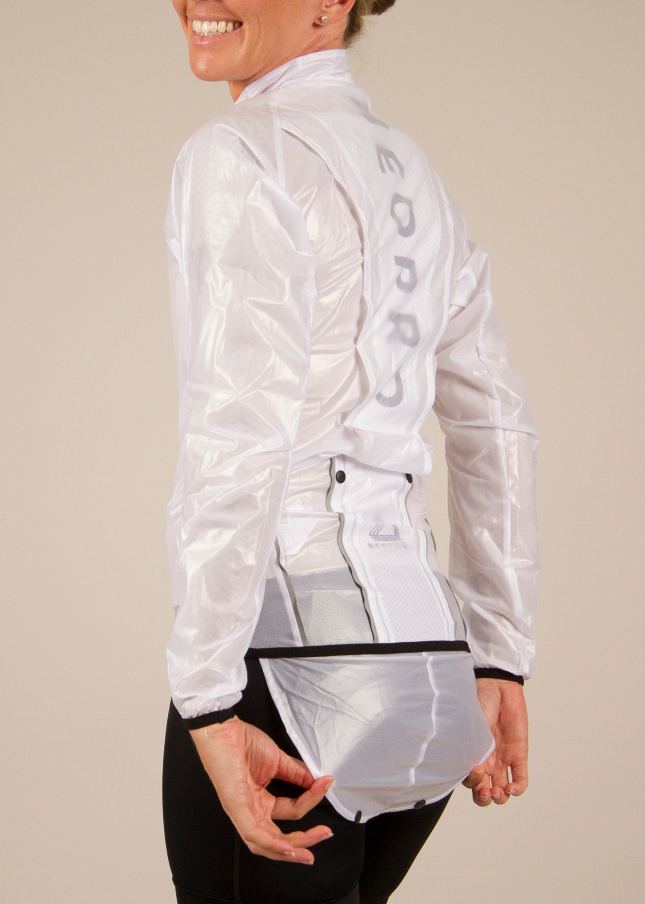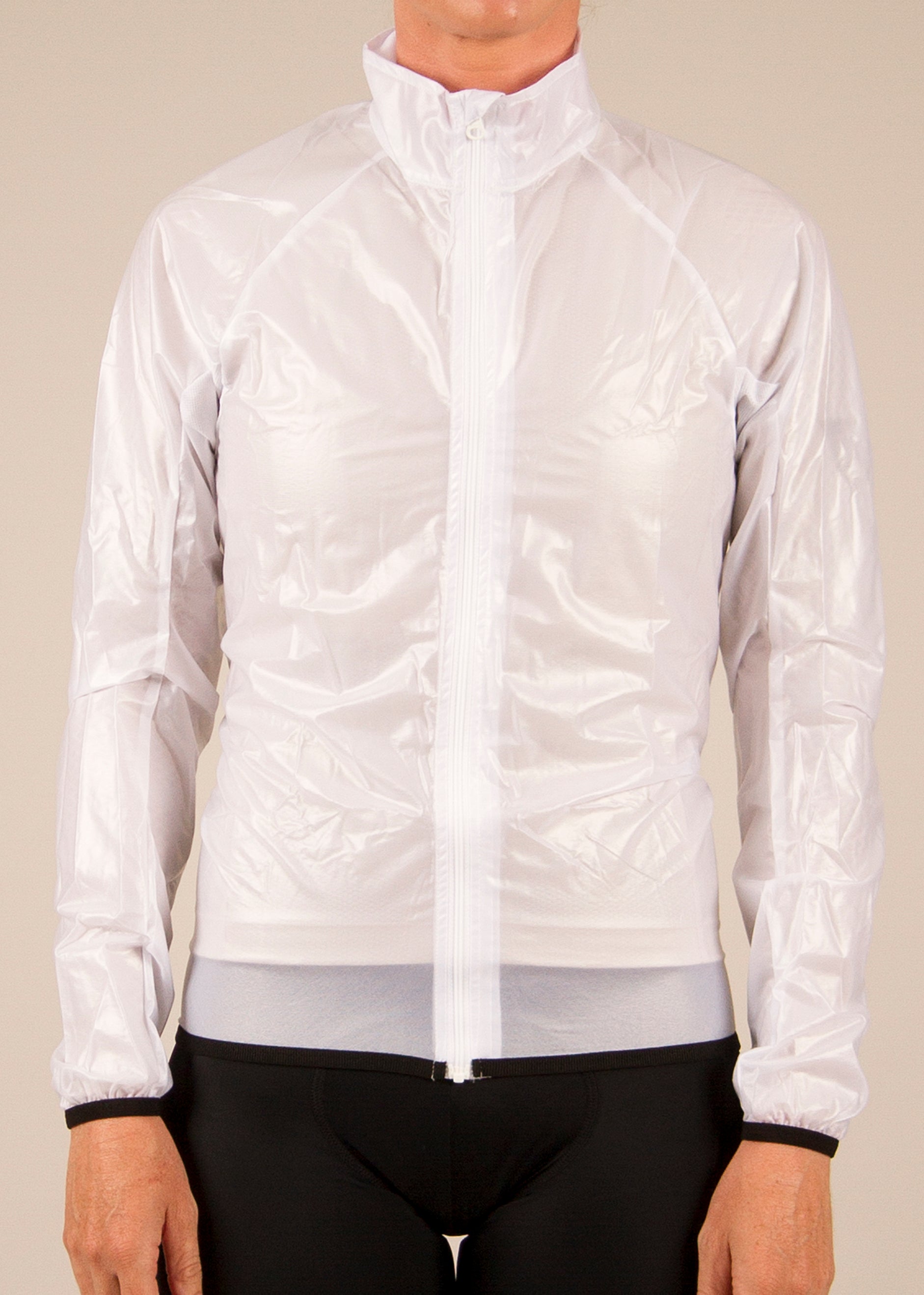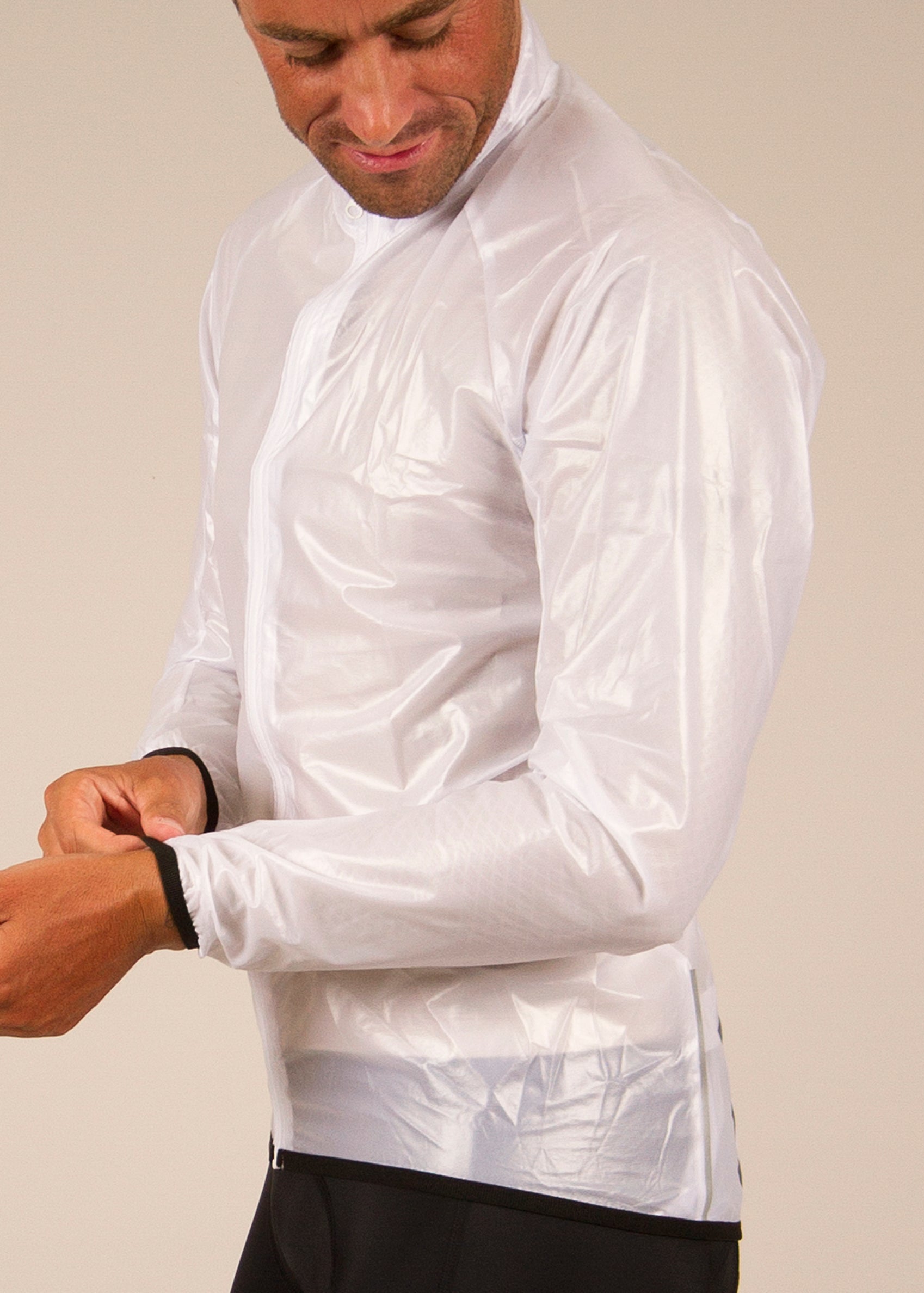 This shower jacket is designed to be the top layer, over a jersey, long sleeve or winter jacket. It scrunches up to fit in your pocket during your ride when not wearing it.