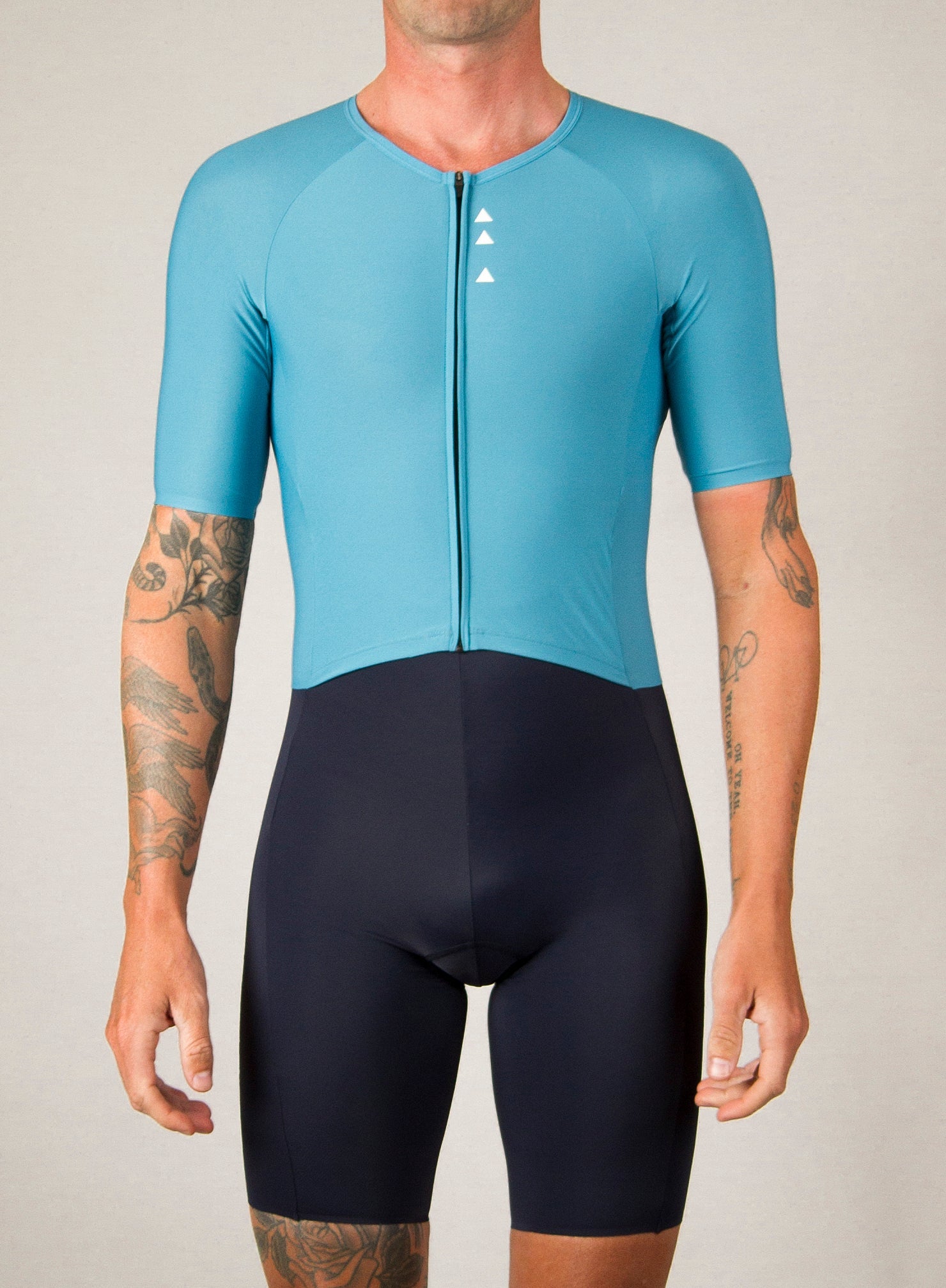 Precision Tri Suit Paneling – Full-length front zip with separate upper and high-waisted lower panels for enhanced comfort, flexibility, and a secure fit across all disciplines.