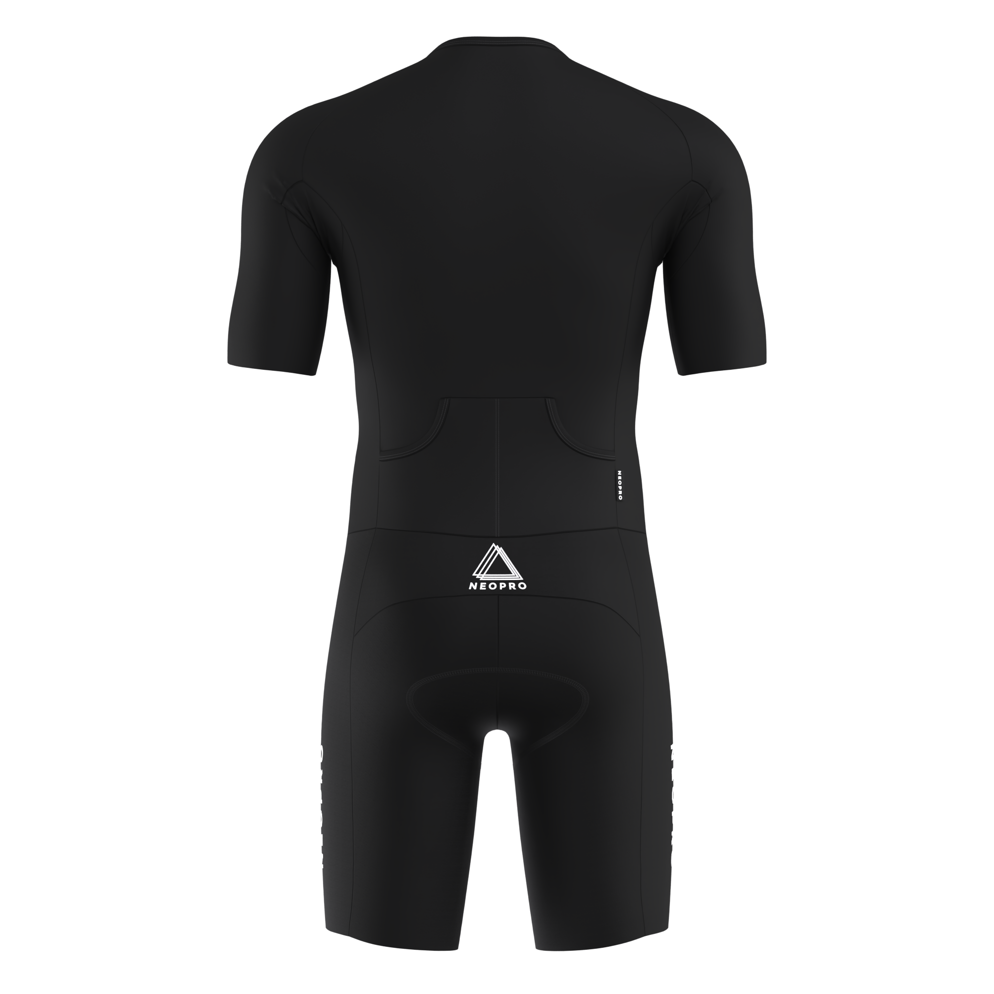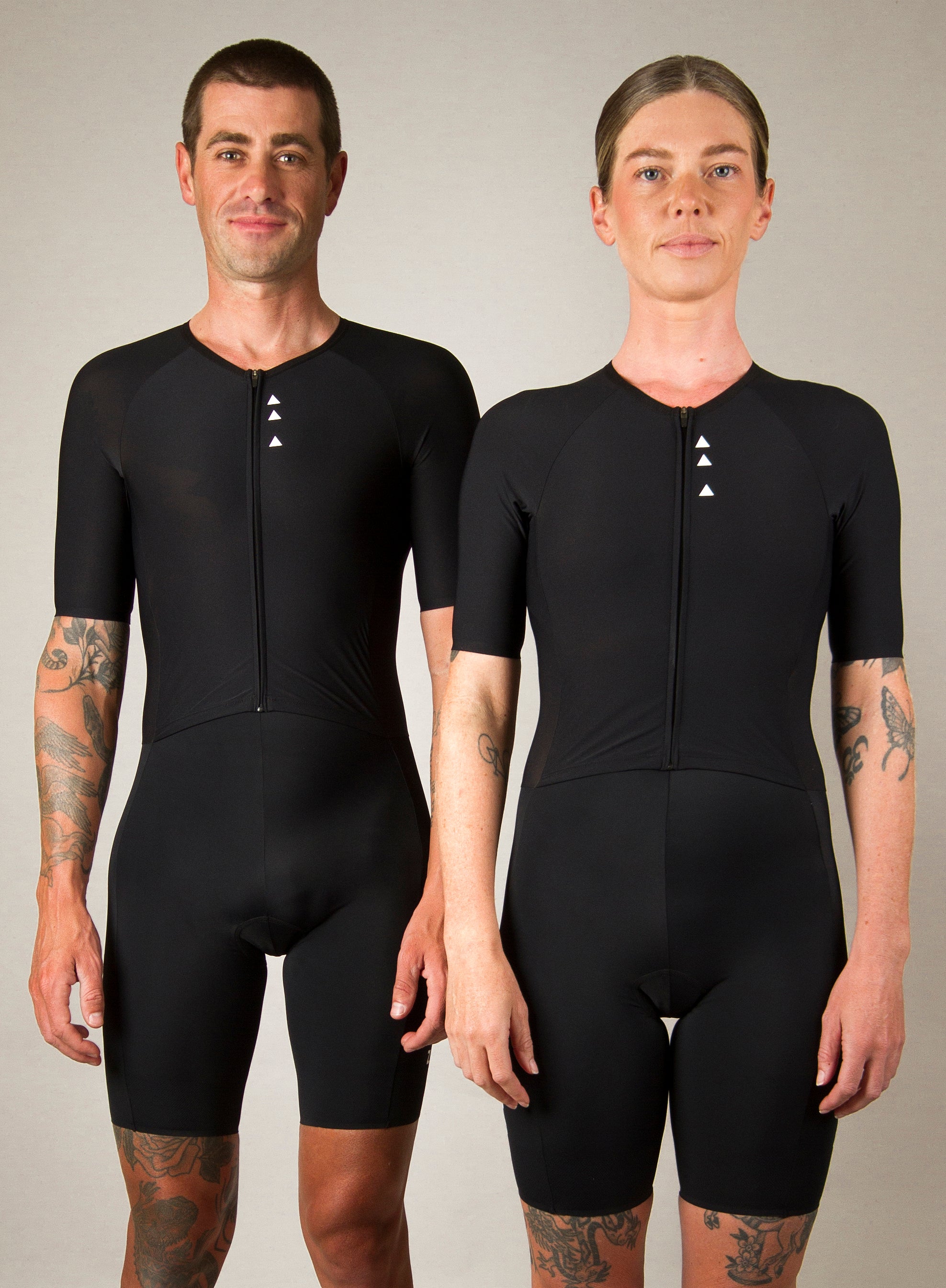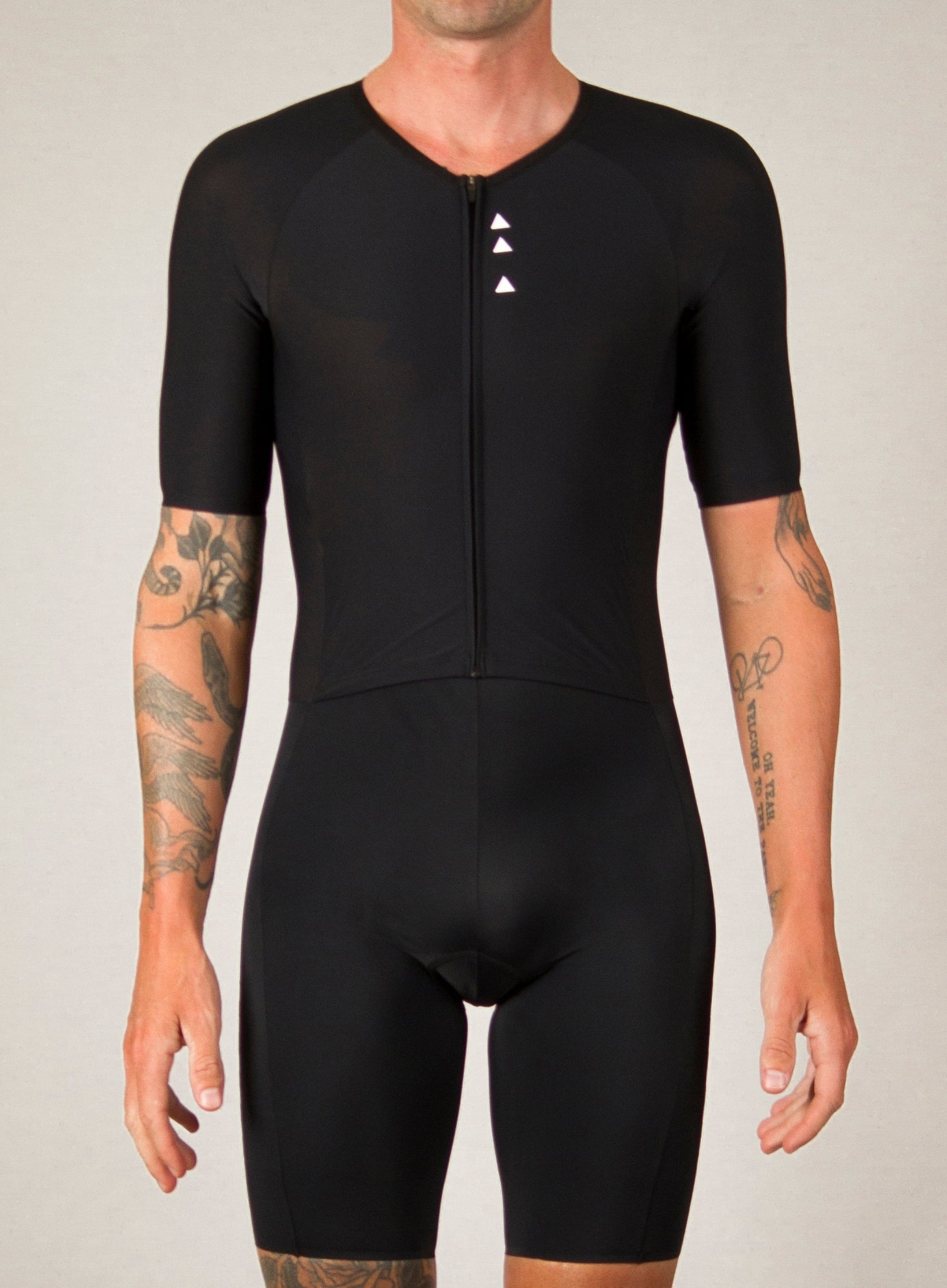 Precision Tri Suit Paneling – Full-length front zip with separate upper and high-waisted lower panels for enhanced comfort, flexibility, and a secure fit across all disciplines.