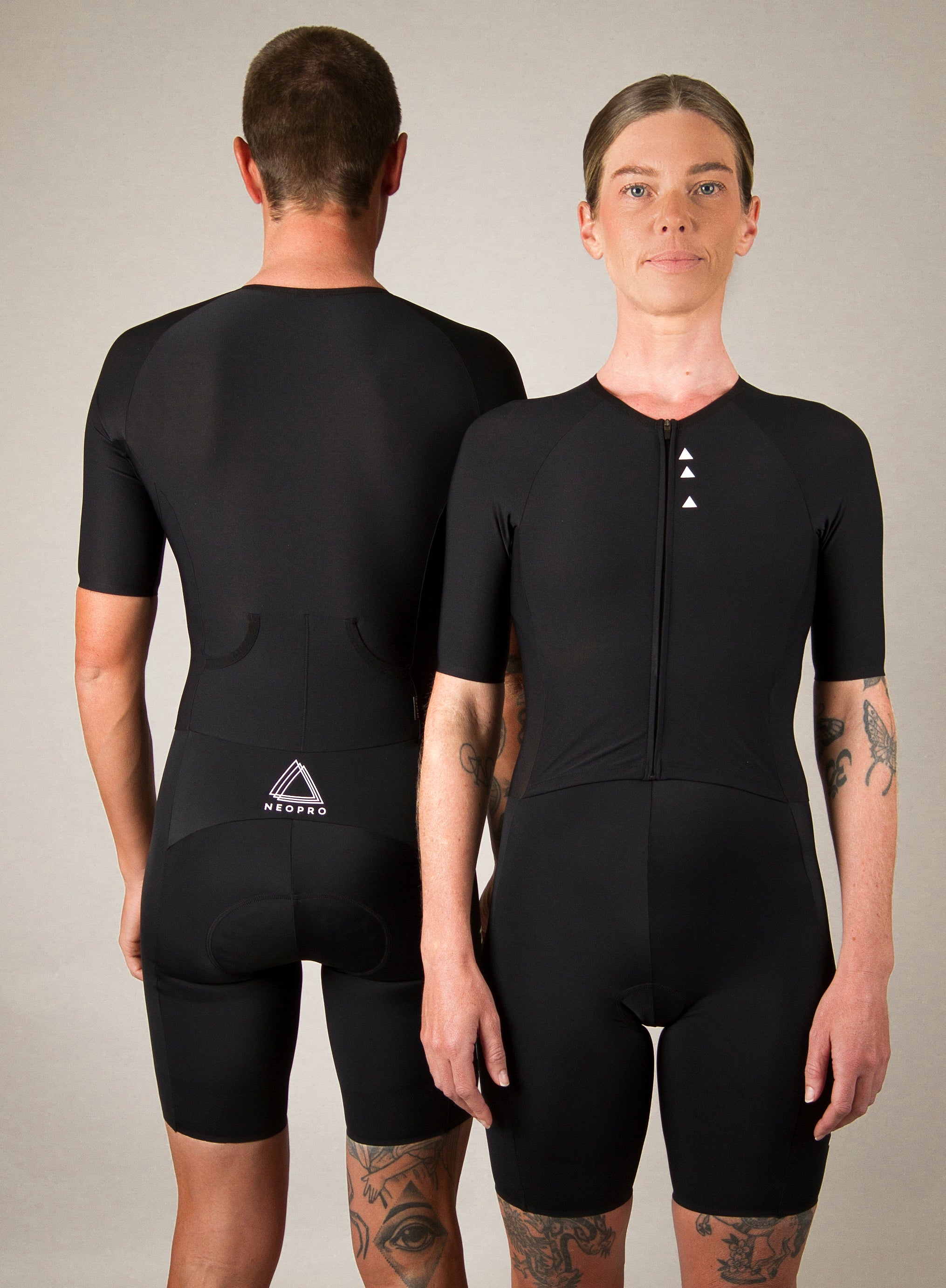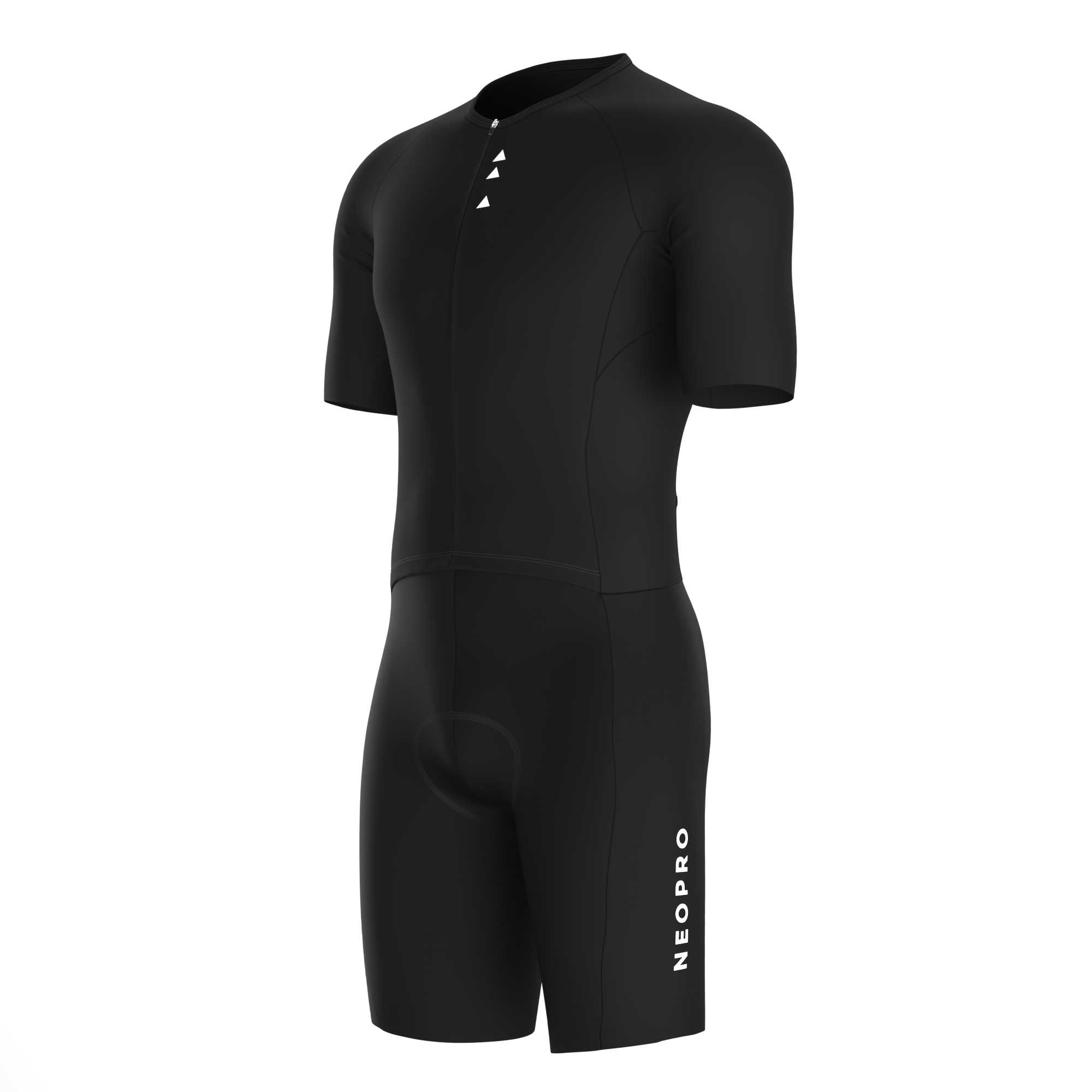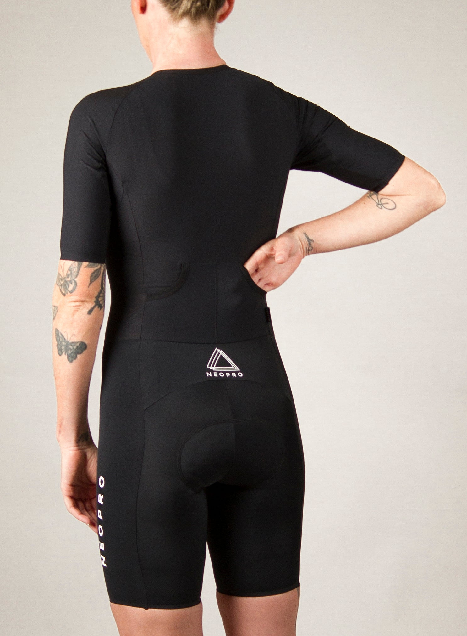 Precision Tri Suit Paneling – Full-length front zip with separate upper and high-waisted lower panels for enhanced comfort, flexibility, and a secure fit across all disciplines.