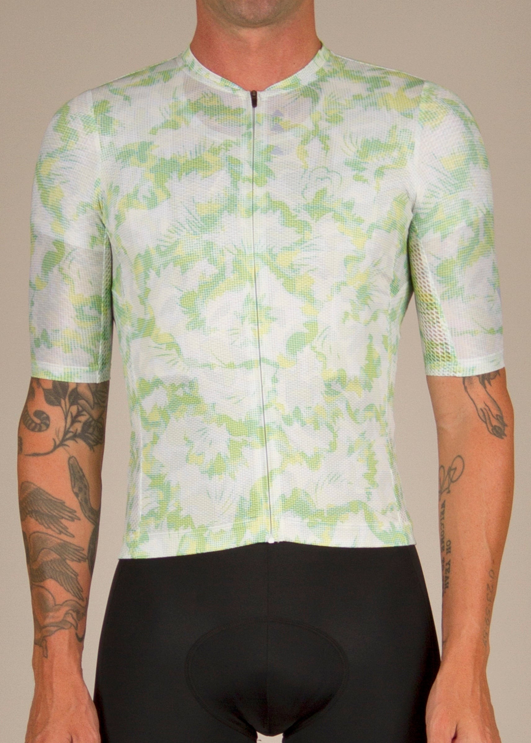This Jersey is a green, lime, grey and white patterned print.
